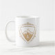 Ascend to new heights every morning with this stylishly personalized coffee mug, featuring an elegant gold-tone mountain range crest within a decorative shield frame. The design can be customized with your own initial or a personalized message, making it a unique and sophisticated accessory for any home or office.