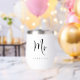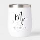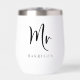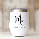 Elegant personalized thermal wine tumbler for a groom or husband to celebrate their wedding or married life featuring "Mr" in a large chic script and your family name in classic serif typography. A matching "Mrs" tumbler is available - message us for the link.