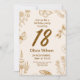 An elegant invitation card design celebrating an 18th birthday. The background features a warm beige tone with delicate decorative elements, including flowers, butterflies, and plants illustrated in fine golden lines