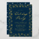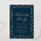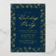 Elegant holiday party invitation with a border of gold foil snowflakes and pine branches on a navy background. "Holiday Party" is displayed in a gold foil calligraphy script with your party details shown below. The snowflake holiday party invitation reverses to display a beautiful snowflake pattern.