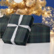 Modern Christmas wrapping paper featuring a timeless design with a muted navy blue and green plaid pattern.