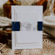 The left and right edges of this elegant modern wedding invitation belly band feature a navy blue watercolor agate border trimmed with faux gold glitter. Personalize it with the names of the bride and groom in gold-coloured handwriting script over a large grey ampersand on a grey and white marble background.