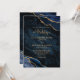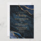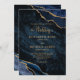 This elegant luxury wedding invitation features a chic trendy navy blue and gold agate gemstone background, with elegant script monogram on the back.
