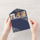 This elegant all-in-one navy blue wedding invitation features delicate gold floral illustrations, a romantic photo collage, and a modern QR code for easy RSVPs. Perfect for couples who want a sophisticated, tech-savvy, and beautiful way to announce their special day. Customize your names, date, and website with ease for a seamless guest experience.