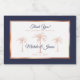 Thank your guests for celebrating with you on your special day with these elegant navy blue and rose gold mini sparkling wine labels featuring the words "Thank you for celebrating with us" and an artistic palm tree and elegant metallic rose gold foil frame over a navy blue background. Easily personalize them with the provided templates for the bride and groom's names and wedding date. If you need help or matching items, please contact me.