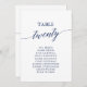 These elegant navy blue table number 20 seating chart cards are perfect for a simple wedding. The neutral design features a minimalist card decorated with romantic and whimsical typography. The card prints on the front and back (double-sided).