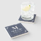 Elegant Navy Blue & White Greenery Monogram Stone Coaster