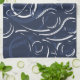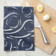 Elegant monogrammed kitchen towel features an artistic abstract geometric circular and wavy swirl composition in navy, cornflower blue and white on a navy blue background. Adorned with a complimentary artistic monogram medallion in shades of navy blue, cornflower blue and white with coordinating script typography in a layered design, with highlights and shadows that give depth and perspective to the overall design. A stylish design inspired by ocean foam when the seawater is churned by breaking waves in the surf zone adjacent to the shore, these blue and white swirls interlock and intertwine to create a visually appealing pattern that shifts from left to right.