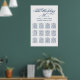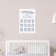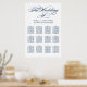 Elegant calligraphy script wedding seating chart poster design features a monogram of the bride and groom names and wedding date and custom template text for twelve (12) table numbers with guest names. Navy blue and white colour scheme can be modified to coordinate with your wedding colours.