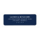 This return address label features a sophisticated, minimalist design with a deep navy blue background and crisp white text. The layout is clean and organized, utilizing ample spacing to highlight the elegant serif typography that conveys formality and refinement. Perfect for formal occasions, this label combines simplicity and sophistication, making it ideal for weddings or other special events where clarity and elegance are essential.