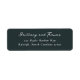 This elegant label features a clean, modern design with a dark teal background and crisp white text. The layout is vertically oriented, emphasizing the names at the top in a stylish script font, followed by an address in a classic serif typeface. The minimalistic approach focuses on typography, creating a sophisticated look perfect for formal occasions or personalized stationery. Its simple yet refined aesthetic makes it ideal for weddings, invitations, or any event requiring a touch of elegance.
