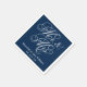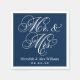 Wedding napkins feature "Mr. & Mrs." in a white calligraphy script font with custom monogram design that can be personalized with the bride and groom's married name and wedding date. Navy blue and white colour scheme.