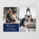 Navy thank you card with 2 photos from your wedding. This card has a large space for you to write your custom messages to each of your guests.