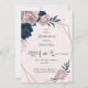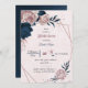 Elegant navy blue and pink flowers and some beautiful leaves on a geometric frame bridal shower invitation