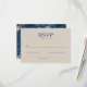 This elegant wedding RSVP card features a minimalist design with a beige background and navy blue text, creating a sophisticated contrast. The layout is clean and organized, with bold serif typography for the "RSVP" heading and lighter serif fonts for response options, ensuring clarity and readability. The customizable space allows guests to indicate their attendance or decline gracefully, making it perfect for formal events. Its simple yet refined aesthetic conveys an air of elegance and simplicity, ideal for couples seeking a classic and timeless look for their wedding stationery.