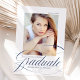 Celebrate your achievement in style with this elegant graduation announcement featuring your senior photo and a sophisticated navy modern calligraphy font. Personalize this timeless photo graduation announcement by adding your name, school name, and graduation year for a custom touch. Perfect for both high school and college graduates, this classic design offers a refined way to share your milestone with family and friends.