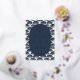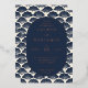 This elegant wedding invitation features a classic rectangular layout with a central oval frame, surrounded by a repeating pattern of stylized seashells. The colour palette includes deep navy blue and gold accents on a white background, creating a luxurious and sophisticated look. The design employs clean lines and serif typography to convey formality and clarity, while the shell motifs add a subtle nautical theme. Perfect for formal occasions, this invitation exudes an inviting and celebratory mood, ideal for couples seeking a timeless and refined aesthetic for their special day.