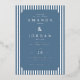 This elegant foil invitation features a classic design with vertical blue and white stripes framing the text. The deep navy background contrasts beautifully with the lighter elements, creating a sophisticated look. Ornate borders add a touch of elegance, while the serif typography conveys formality and tradition. Perfect for weddings or formal celebrations, this invitation exudes an air of anticipation and celebration, making it ideal for significant life events.