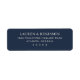 This return address label features a clean, elegant design with a solid dark navy background and crisp white text. The layout is minimalist, showcasing a centred arrangement of customizable placeholder text in a classic serif font that conveys sophistication and timelessness. Ample negative space enhances readability and adds to the refined aesthetic, making it perfect for formal invitations or announcements. The overall mood is sophisticated and understated, ideal for those seeking a stylish yet simple presentation.