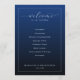 This elegant wedding program features a deep navy blue background with a clean, centered layout that exudes sophistication. The design combines flowing cursive script for the welcoming message and crisp sans-serif fonts for the ceremony details, creating a harmonious balance between modern and classic styles. Ample negative space enhances readability while maintaining an understated luxury feel. Perfect for formal weddings, this template allows customization of names and dates, making it ideal for personalizing your special day.