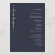 This elegant wedding program features a deep navy blue background with a minimalist layout, creating a sophisticated and formal atmosphere. The design includes a flowing script font for the names on the left, paired with clean, centered sans-serif typography for the ceremony details on the right, ensuring clarity and readability. Customizable elements allow personalization of dates and locations, making it perfect for any wedding celebration. The overall style is refined and modern, ideal for couples seeking an understated yet stylish way to guide their guests through the special day.