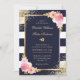 Elegant navy blue and white floral wedding invitation featuring blush pink, ivory and peach flowers and gilded greenery on a dark navy blue and white striped background. Matching items available to complement this navy blue floral wedding card.