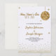 Elegant New Year's Eve wedding invitation with a gold sequin disco ball and stars. The text is in gold and black, set against a white background with a gold confetti border. The back is plain with a subtle textured pattern.
