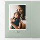 Elegant faux pale gold frame adorned with winter berry branches on festive minty sage green colour backgrounds. Design features, framed bold type NOEL, template text lines for names, year and messages with 5 photo spaces on inside.
