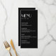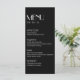 Un élégant menu pour le dîner pour vos invités. Cette carte de menu noir présente une typographie blanche moderne avec le titre Menu et votre date de mariage à l'avant. L'envers est noir. Tout le texte de l'avant est justifié.