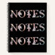 A cute, simple design of the word Notes spelled out three times in pinkish gold watercolour letters which have flowers on them and set against a plain black background.