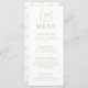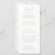 Enhance the charm of your wedding reception with these sophisticated and stylish olive green and white tulip floral wedding menu cards. Decorated with delicate floral pattern and showcasing a timeless floral wreath embellished with the bride and groom's monogram.