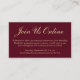 Elegant burgundy red enclosure card to provide an online option for guests who cannot physically attend your graduation party in person due to distance or other circumstances. "Join Us Online" is written in a stylish light gold script and you can personalize the virtual online details in modern light gold typography.