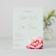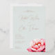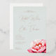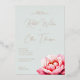 This elegant wedding invitation features a soft, pale blue background with a large pink peony flower illustration on the lower right side. The design includes customizable cursive script for names and details, set in gold or light brown tones that contrast beautifully against the cool backdrop. With its clean serif font for event specifics and an overall theme of classic elegance blended with modern minimalism, this invitation conveys a mood of refinement and joy, perfect for celebrating a special occasion.