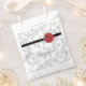 This design features elegant vintage leaf pattern and personalized wax seal image. The damask grey leaf patterned background contrasts against the black ribbon and red wax seal. The combination of grey, red, black and white colours create a sophisticated, trendy and chic style. Elegant wedding favour bag design with modern elements. The simple setup of the typography gives it a distinct style. Matching wedding invitations and other stationery items are also available.