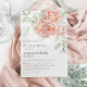 With a watercolor bouquet of peach flowers and soft greenery, and left-justified text, this floral wedding invitation combines classic romantic elegance with modern style for timelessness that will impress your guests. The names of the bride and groom in classy fonts are linked by an elegant script ampersand.
