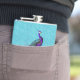 Elegant lady's flask done in a turquoise swirly pattern background, with graphics of a colourful purple and teal peacock sitting on a lavender flourish. Personalize the purple script text to suit your needs. Makes a lovely gift idea.