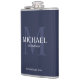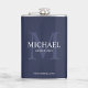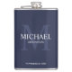 This flask features personalized groomsman's name with title and wedding date in white and monogram in light navy blue as background, in classic serif font style, on navy blue background.