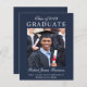 Budget-friendly simple and elegant dark blue graduation announcement featuring a photo of the graduate, his or her name and class year in a white script and his or her school, major and honours in modern white typography.