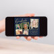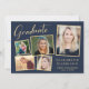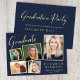 Elegant dark blue graduation party invitation featuring a five photo collage of scattered pictures in gold frames, "Graduate" in a stylish gold script, and the grad's name, school and class year in simple modern gold typography. Add your party details on the back.