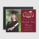 Modern burgundy red college graduation magnetic card announcement featuring "Class of" within a laurel wreath, a grad cap and a diploma, a photo of the graduate and their name in an elegant light gold script. Add their school, major, honours or future plans in modern light gold typography.