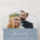 Elegant dusty blue elopement and small wedding announcement combined with an all-in-one wedding reception invitation to announce your marriage to family and friends and to invite them now to a post-wedding reception or party. This design features your photo and customized marriage announcement and reception invitation, "Happily Ever After Party" in a mix of simple white typography and a chic white script with swashes. Add your names in a signature-like script. A tear away RSVP postcard provides a convenient and eco-friendly and envelope-free response from your guests.