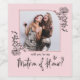 Modern, trendy Matron Of Honour proposal wine bottle labels. Design features single photo inside arch frame with floral elements on a blush pink background, typography script '' will you be my Matron Of Honour''.