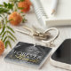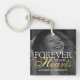 Elegant memorial tribute keychain featuring a picture of your lost loved one, the text "forever in our hearts", and their name.