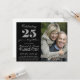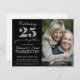 A very pretty, bold black, white and grey "silver" coloured design that works well with black and white or full colour photograph of the married couple celebrating a milestone twenty-fifth wedding anniversary. Invite family and friends to a special celebration. The design features classy faux glitter effect font numbers 2 and 5 and fancy script handwriting text with flourishes and curls, next to a large photo area that appears to be wrapped in a pretty faux silver glitter ribbon. Adjust your photo image sizes and cropping to suit, adjusting the ribbon if needed also by clicking the customize button. Sample image is for illustration purposes only - replace with your own photograph. Note that all embellishments are digital only, this is a flat printed product and there are no real ribbons, gems, diamonds, satin or other materials on this invitation.