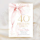 Elegant pink bow 40th birthday invitation. Feminine design in blush pink and gold. Features trendy watercolor coquette bow, and modern typography font. Perfect for an elegant style women's bday celebration. Personalize with your own details. Printed Zazzle invitations or instant download digital printable template.