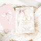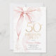 Elegant pink bow 50th birthday invitation. Feminine design in blush pink and gold. Features trendy watercolor coquette bow, and modern typography font. Perfect for an elegant style women's bday celebration. Personalize with your own details. Printed Zazzle invitations or instant download digital printable template.