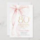 Elegant pink bow 80th birthday invitation. Feminine design in blush pink and gold. Features trendy watercolor coquette bow, and modern typography font. Perfect for an elegant style women's bday celebration. Personalize with your own details. Printed Zazzle invitations or instant download digital printable template.