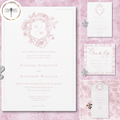 Elegant Pink Chinoiserie Bird & Crest Wedding Invitation