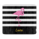 This black and white cutting board can be personalized with your custom text such as your name in faux (not foil) gold script at the bottom. A pink flamingo is above the text. The tropical bird appears on a black and white striped pattern.