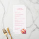 This elegant wedding menu features a vertical layout with a soft pastel colour palette of light pink and white, creating a sophisticated and inviting atmosphere. The design includes clear sections for starters, salad, main course, and dessert, each highlighted by bold headings and clean serif typography. A large, detailed floral illustration adds a touch of realism and elegance to the right side, while ample spacing ensures readability and a structured hierarchy. Perfect for formal events, this menu combines classic style with modern simplicity, making it an ideal choice for couples looking to set a warm and welcoming tone on their special day.